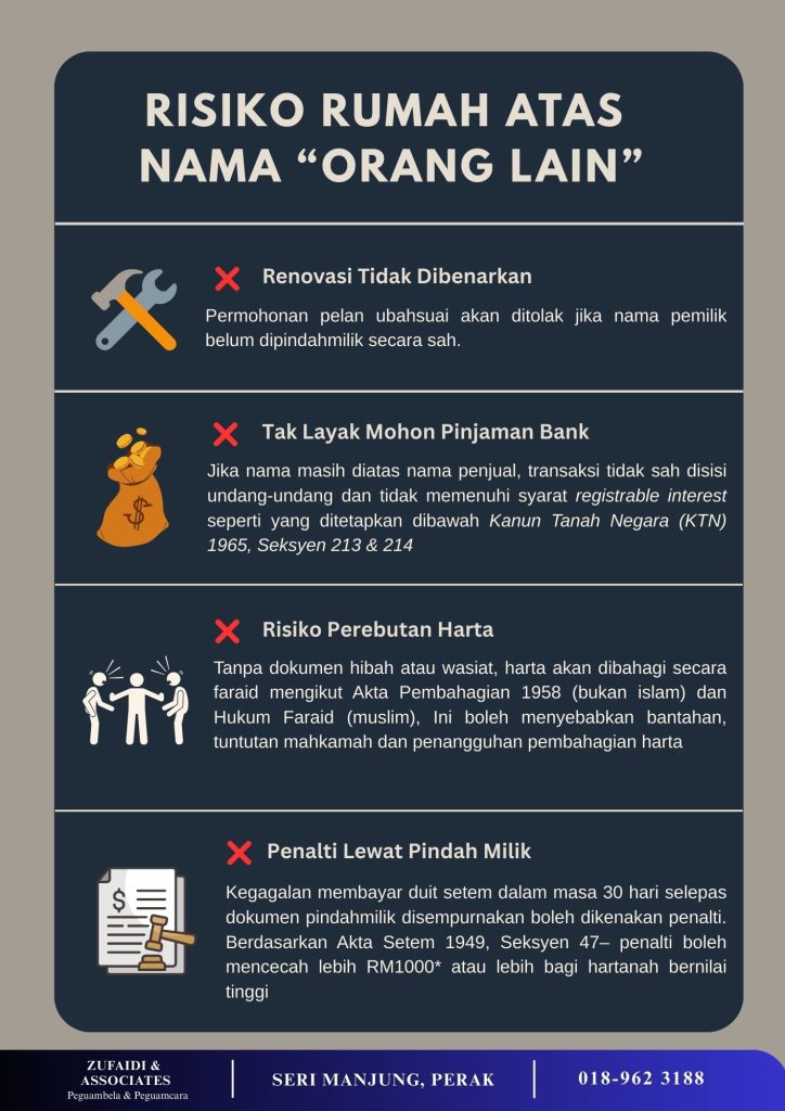 Ramai dalam kalangan kita tinggal di rumah yang masih berdaftar atas nama arwah. Mungkin sebab rasa “nanti-nantilah” atau tak tahu nak mula dari mana. Tapi hakikatnya rumah yang belum dipindah milik boleh jadi beku- tak boleh dijual, tak boleh dibina semula, dan boleh jadi punca pertikaian waris.
